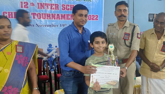 A Yohan Jain from class IV won the 4th place by scoring 5 out of 6 points in 12th Inter School Chess Tournament conducted by – Kalaimagal Vidyalaya.