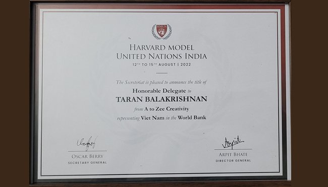 Taran Balakrishnan of grade X participated in Harvard Model United Nations held at Hyderabad. He bagged the Honorable Delegate Award, representing the World Bank.