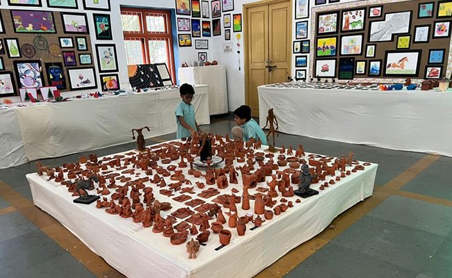 Varnajala, our annual art exhibition showcased around 1500 works of art, craft and sculpture of students, parents, teachers, admin team, akkas and ann as. The event compiled myriad expressions of Art such as pencil shading, embroidery, pottery, sculpture, murals, canvas paintings, water colour works, candle making, weaving, recycled crafts and more. Students across grade levels took turns and visited the exhibition. The exhibition was also open to parents.